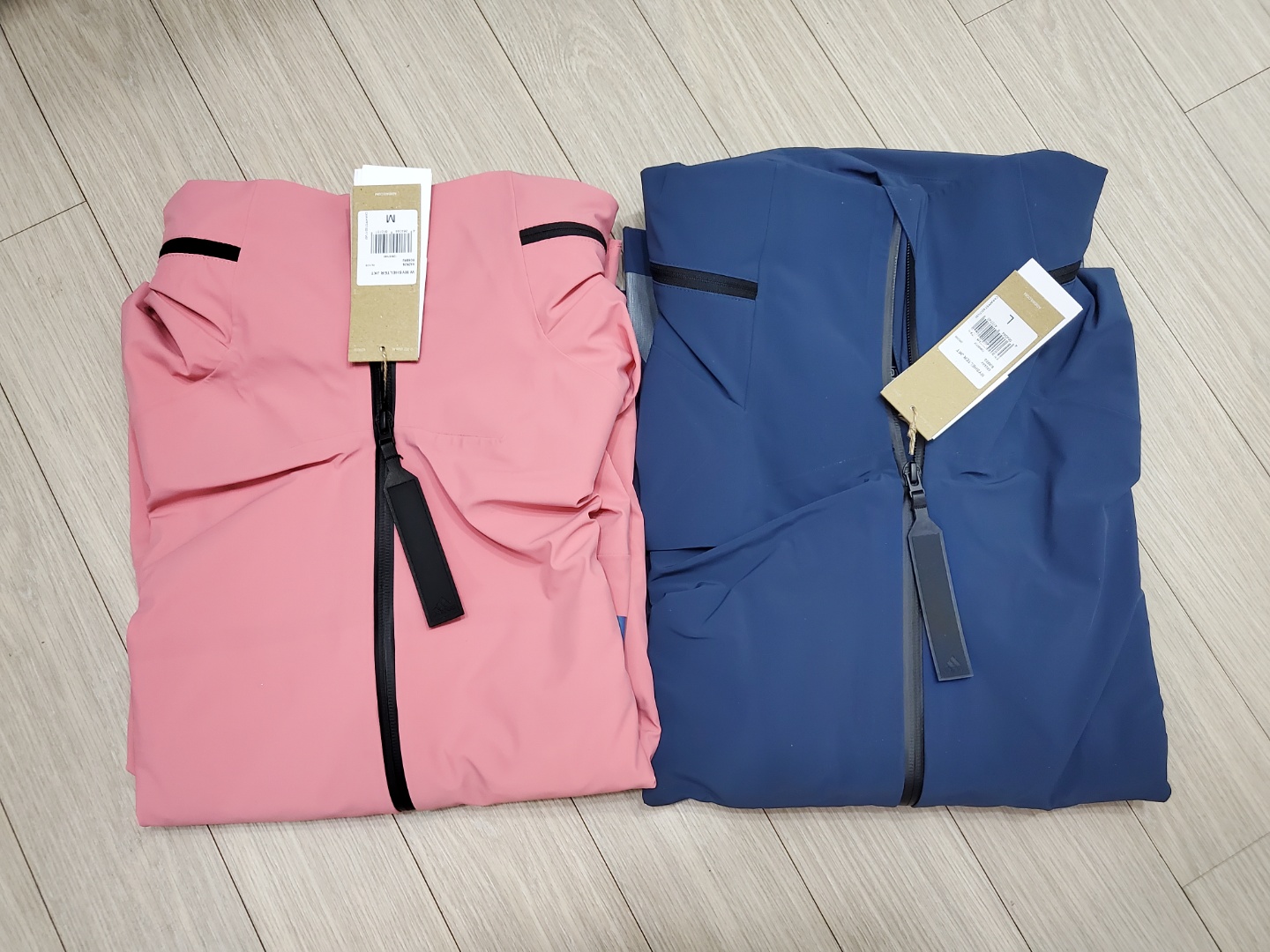 남성용 재킷 색상은 어떤 가요? 남편은 네이비 컬러를 구매했어요. 사실은 블랙 컬러가 아디다스 홀로그램 마크가 더 눈에 띄고 고급스럽긴 한데요. 이번 남성용 네이비 컬러는 정말 잘 빠졌어요. 네이비 컬러도 소재와 정말 잘 어울리게 고급스럽네요. 남편도 블랙과 한참 고민하다가 트레이닝복이 대부분 어두운 색이기도 하고 다가오는 계절에 핑크와 네이비가 정말 잘 어울릴 것 같아서 이 조합으로 커플 옷으로 구매했어요. 남편은 커플 옷 입는 거 정말 싫어하는데 이건 같이 입겠다고 하네요.