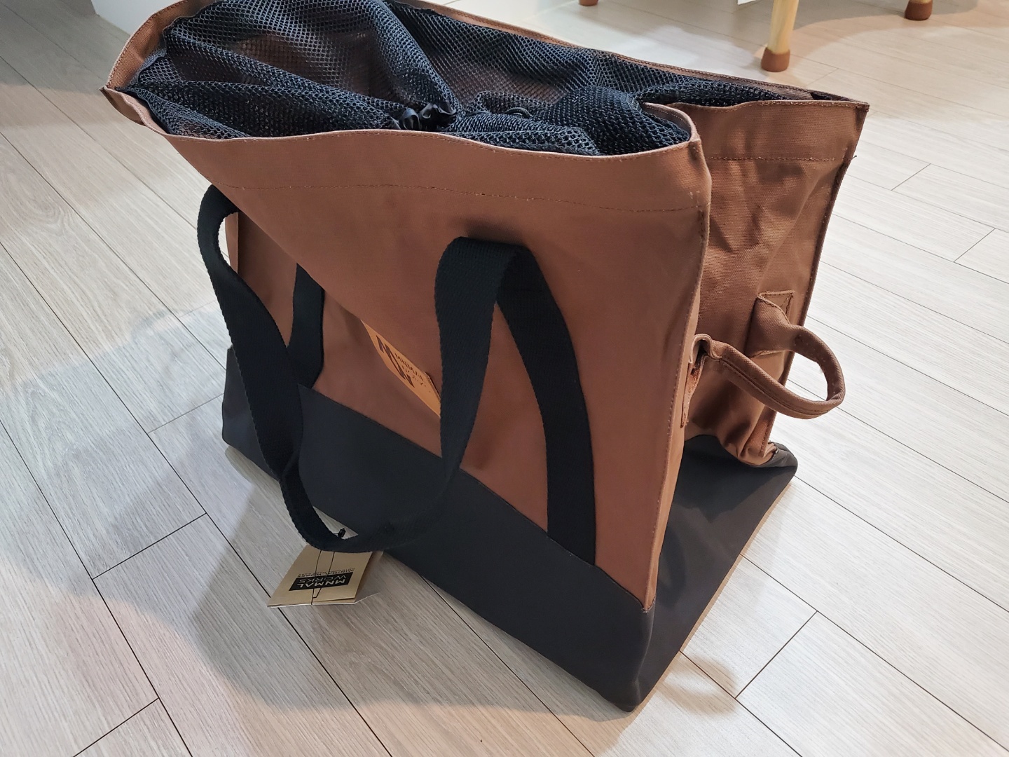 1박 2일로 다니는 캠핑에는 둘이 쓰기에 공간이 많이 남았어요. 특히 동계에는 별로 옷 갈아입을 일도 없고 외투가 중요한데 거의 착용하고 있는 상태고요, 봄가을에는 옷이 얇아서 부피가 작아서 공간이 남더라고요. 그래서 여기에 써큘레이터, 이북리더기, 화장품 등등 이것저것 다 때려 넣고 다녔더니 너무 효율이 떨어지는 거예요. 이북이 고장 나기도 했고요. 그리고 물건 찾을 때도 너무 헷갈렸어요. 잘 나눠서 정리를 잘못한 제 잘못도 있지만, 일단 공간이 크고 남으면 다른 짐 줄이려고 때려 넣게 되더라고요. 그리고 보통 박스처럼 되어 있어서 이 캐리백 위에 조명이나 미니 히터 혹은 스마트폰을 올려두는 경우도 많은데 꼭 그럴 때마다 안에 있는 물건을 꺼낼일이 생겨서 물건을 내렸다 올렸다 일도 아니었어요. 마지막으로 제일 불편했던 점은 차량에 짐을 실을 때였어요. 캐리백이 천으로 쌓여 있어서 포근해 보이지만 박스 형태로 각이 잡혀 있는 형태라서 유동적으로 짐을 싣기가 어려웠어요. 일반 가방일 때는 구겨 넣기도 하고 자투리 공간에 밀어 넣기도 했는데 이 캐리백이 정말 한 짐 차지하더라고요. 그래서 유동적으로 쓸 수 있는 가방을 구하게 되었습니다.