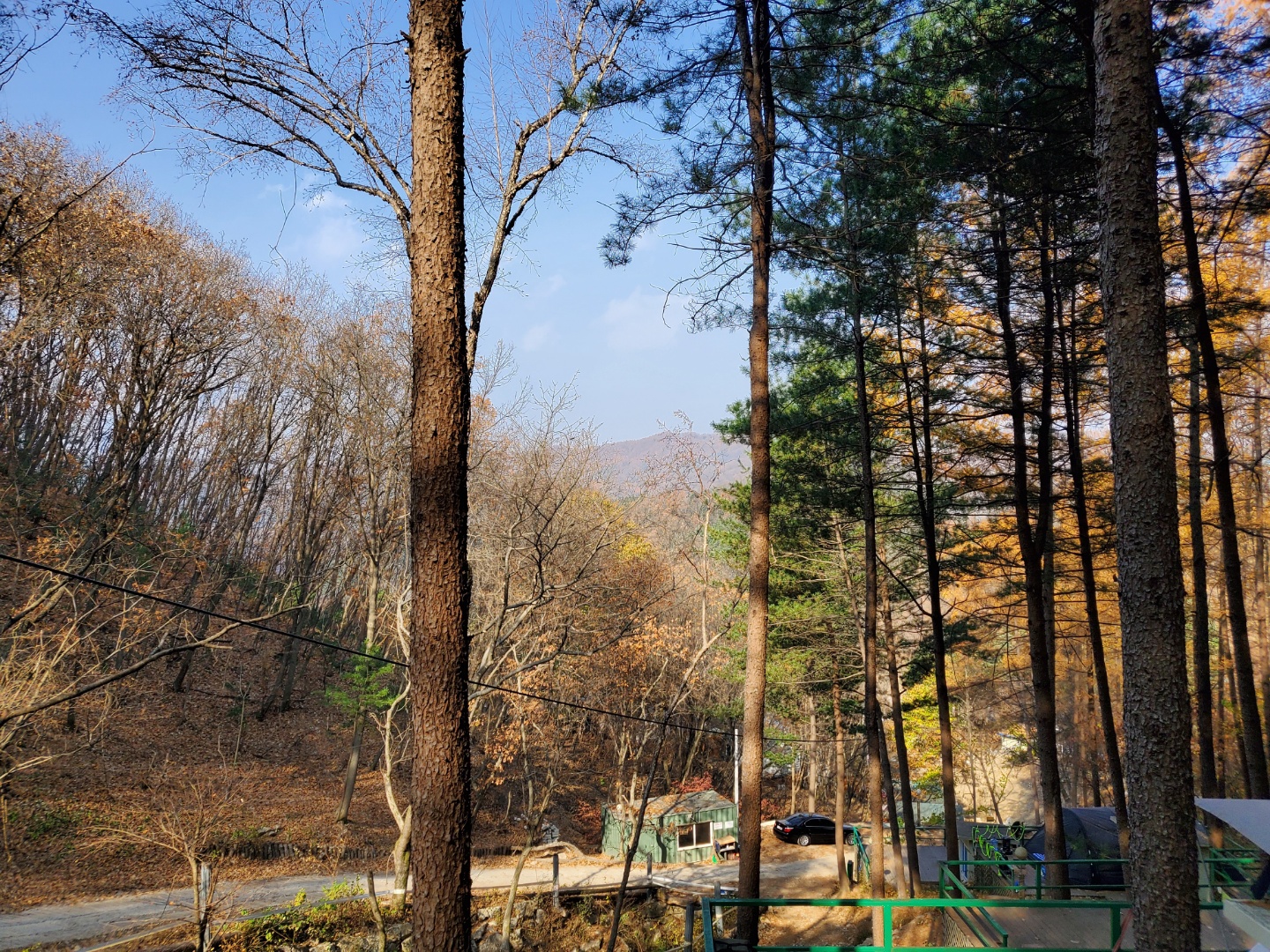 지난번 가을에 잔디밭으로 캠핑을 다녀오고 텐트에 잔디 박힌 게 때어내기도 너무 청소하기 힘들어서 이번엔 꼭 데크로 가야지 했는데 데크 사이트가 훨씬 깔끔하고 편하긴 하더라고요. 가을은 꼭 데크나 폐쇄석으로 갑시다. ㅎㅎ피칭을 하고 나니 낙엽이 조그만 바람에도 우수수 떨어지더라고요. 정말 운치 있었어요. 산 중턱이 캠핑 사이트가 층층이 있어서 피칭을 다 하고 나서 보니 산나무에 폭 감싸 안긴 느낌이더라고요. 이곳은 정말 오셨던 분들이 자주 오시는 캠핑장 같았어요. 다들 피칭하시는 속도가 어찌나 빠르던지 익숙해 보이는 모습이었어요.