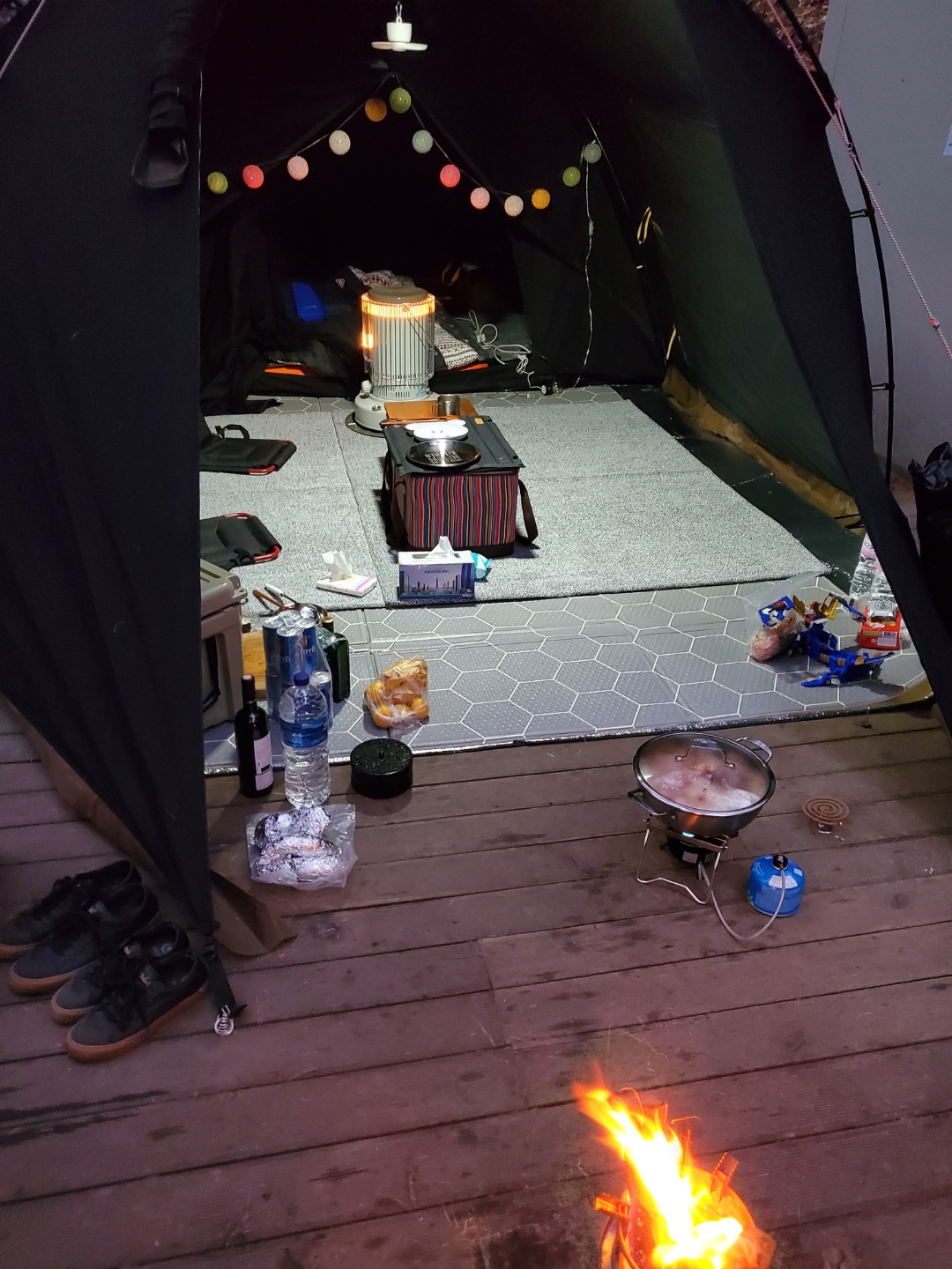 이날은 처음으로 좌식 세팅하던 날이었어요. 바닥에 매트도 깔고 난로도 옆에 두고 친구네 부부랑 정말 많은 얘기를 나눴네요. 텐트 안에서 두 발 뻗고 있는다는 게 이렇게 편한지 몰랐네요. 친구네 부부는 아이가 4살인데 바닥 세팅을 하니 엄청 좋아하더라고요. 친구네 부부가 다음번에 본인들도 좌식 세팅한다고 한참을 좋다고 얘기를 했네요. ㅎㅎ