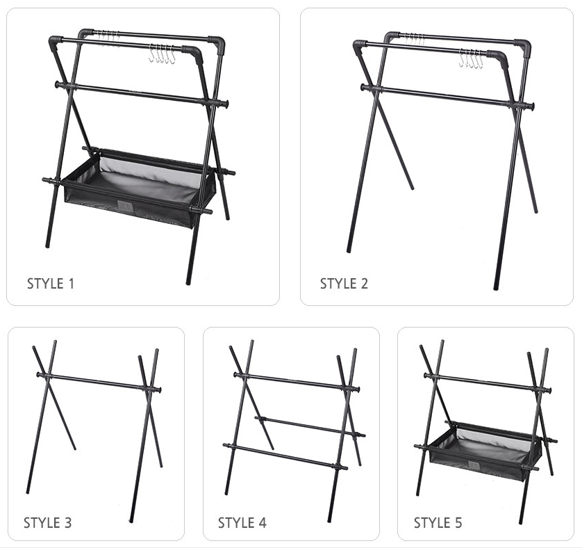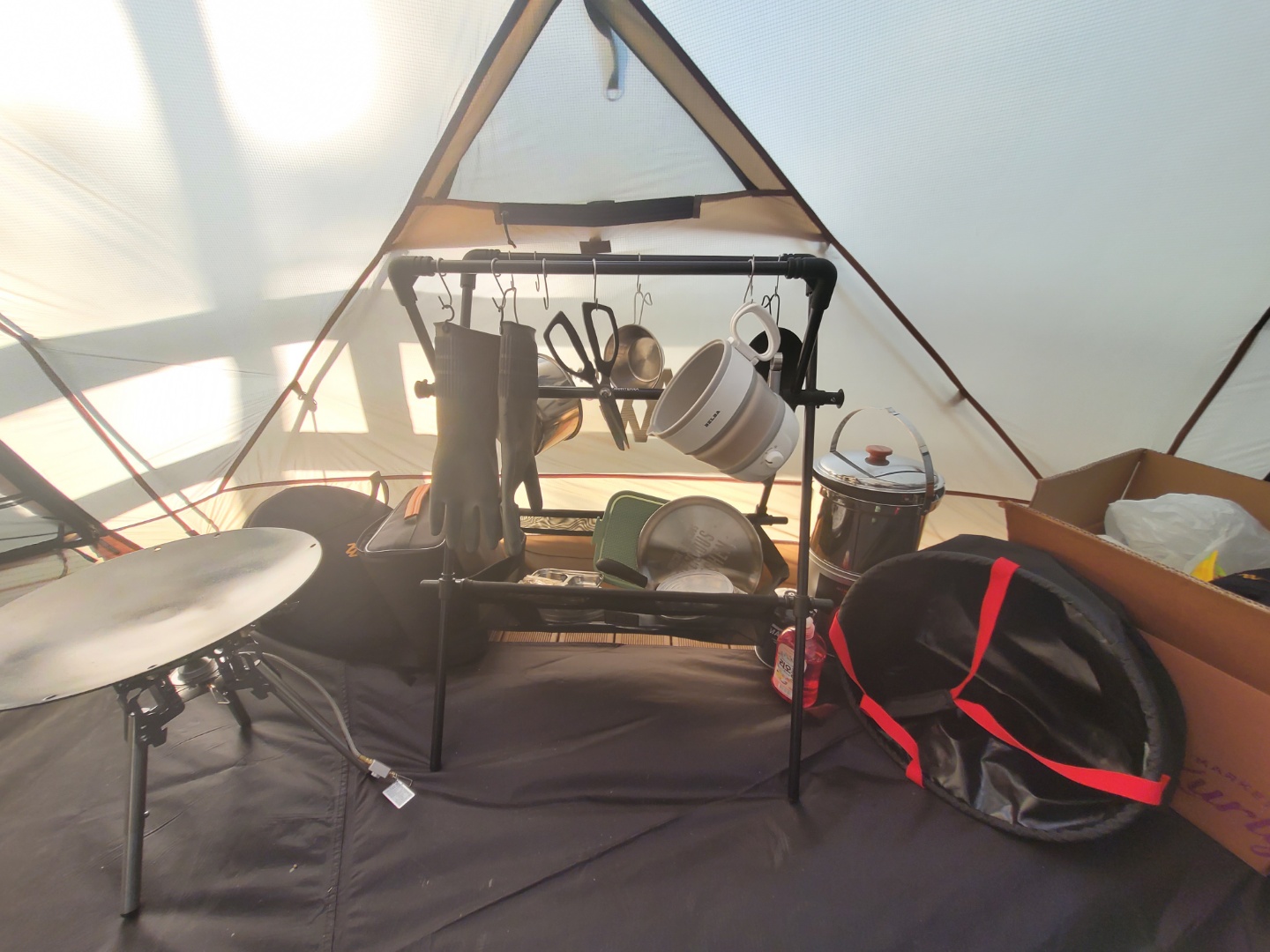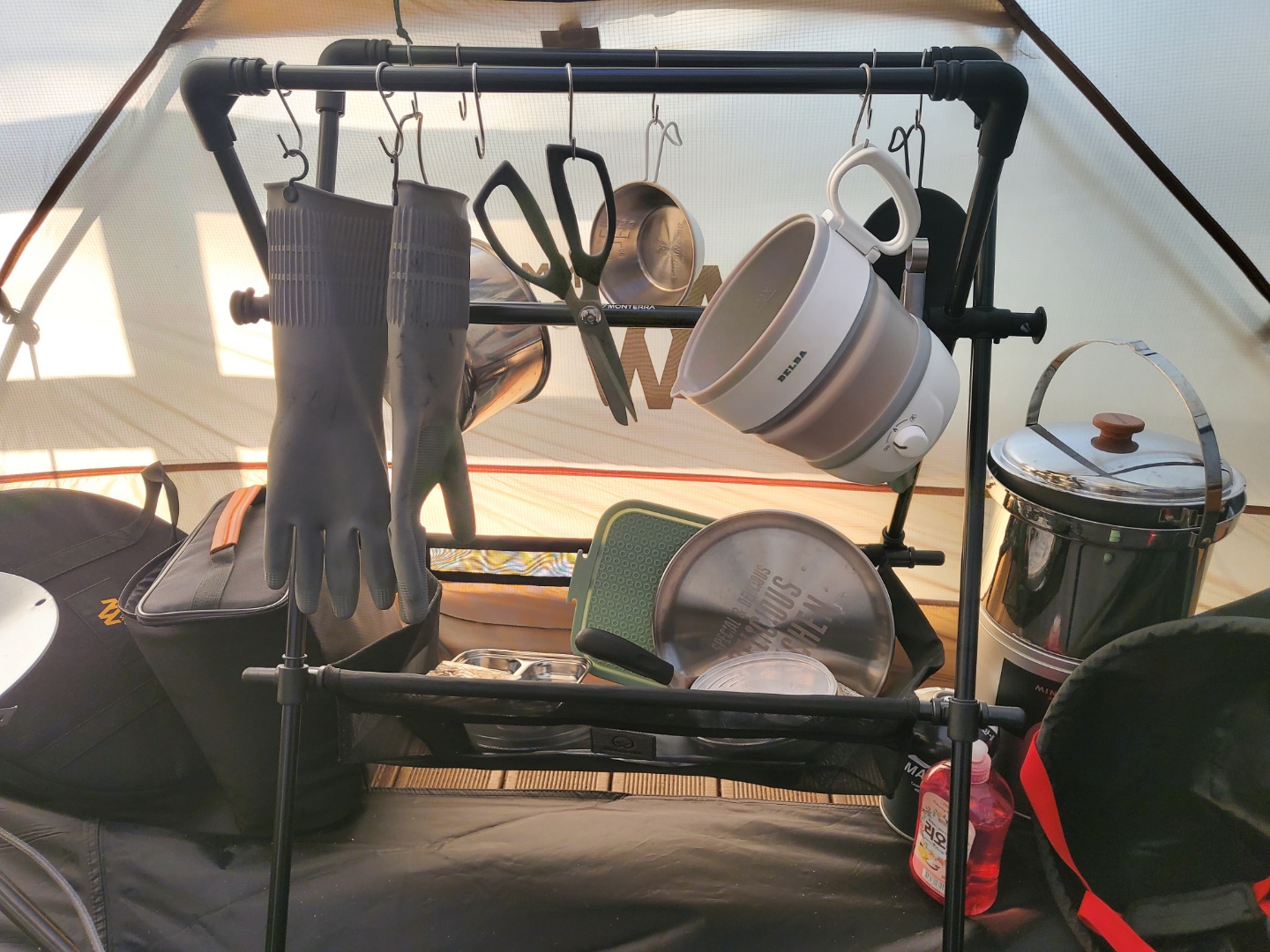 그래서 어렵게 타협해서 구매한 제품이 스틸로 된 선반이었어요. 올블랙 텐트에 어울리게 2단 스틸 쉘프를 들고 다녔는데 이건 부피는 작은데 무게가 장난 아니게 무겁더라고요. 젖은 물건들을 올려놔도 우드 제품은 썩거나 뒤틀릴 수 있는데 이건 스텔 제품이라 썩을 일도 없고 뜨거운 물건을 막 올려놔도 좋았고요. 그렇지만 무게에서 압박이 있었어요. 물건들을 늘어놓으면 사용할 때 좋다고 추천받은 거였는데 오히려 그게 짐이 되더라고요. 큰 공간을 만들 수가 없으면 가지고 있는 제품들을 줄여야 되는데 결론은 하나였어요.