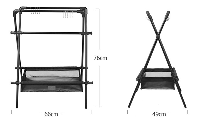 전체 사이즈가 매우 적당해요. 높이와 앞뒤 폭이 텐트안에 큰 공간을 차지하지 않아서 좋아요. 저희 부부가 사용하기 아주 좋고요. 위에 고리도 매우 많아서 하나씩 걸어두기 좋습니다.