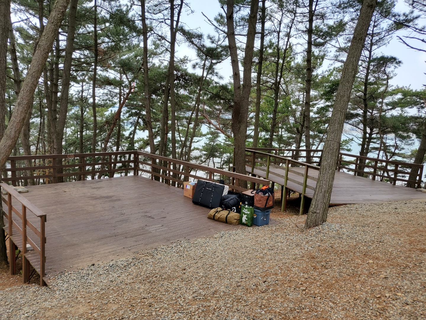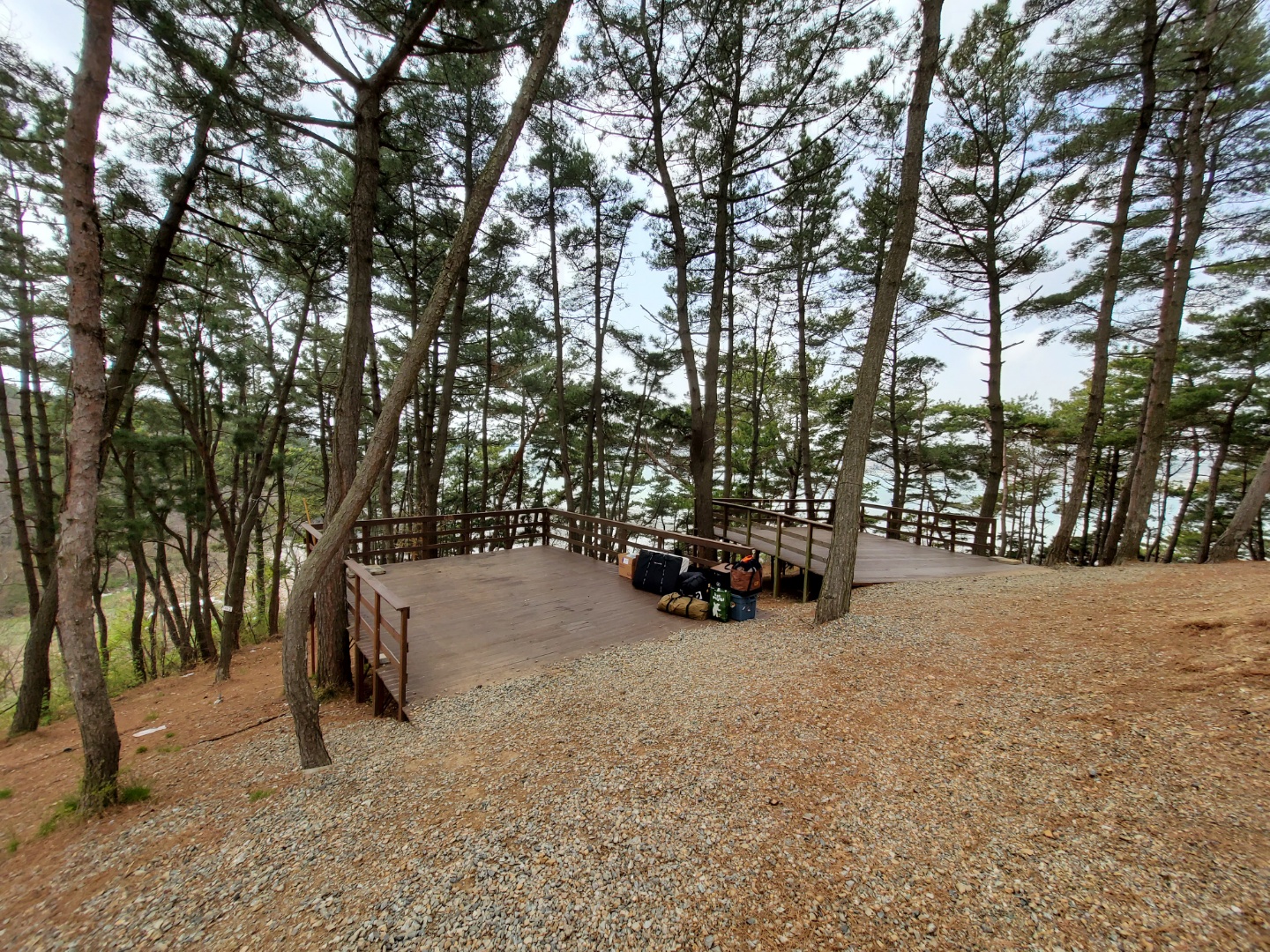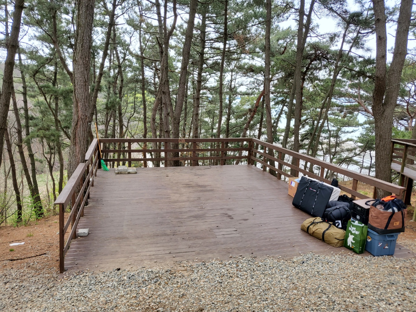 보기에 명당자리는 캠핑장 가장자리였어요. 그래서 그나마 널찍해 보이고 제일 구석진 C14 자리를 선택했습니다. 작은 데크는 50000원이고 큰 데크는 60000원으로 만원 가량 차이가 납니다. 가장자리는 앞에 바닷가가 보이는 뷰라 그런 면에서는 다 명당자리인 거 같아요. 주변에 오래된 나무 들고 많고 캠핑장 환경은 잘 되어있더라고요. 바닷가 근처의 캠핑장은 처음이었는데요. 저는 주로 숲 속이나 산속이나 계곡 옆에만 다녀서 많은 차이를 느꼈어요.