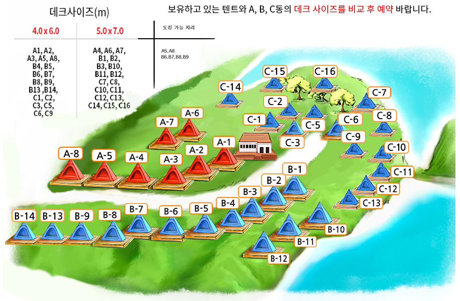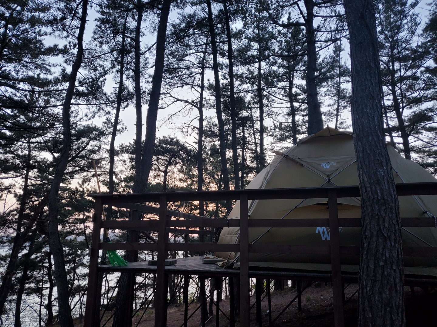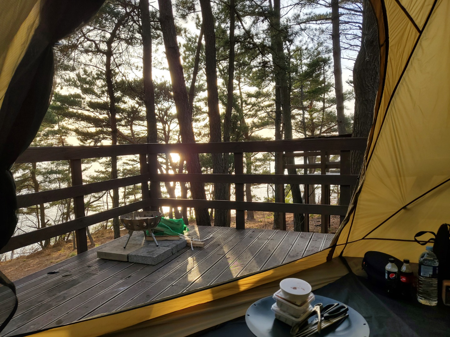 보기에 명당자리는 캠핑장 가장자리였어요. 그래서 그나마 널찍해 보이고 제일 구석진 C14 자리를 선택했습니다. 작은 데크는 50000원이고 큰 데크는 60000원으로 만원 가량 차이가 납니다. 가장자리는 앞에 바닷가가 보이는 뷰라 그런 면에서는 다 명당자리인 거 같아요. 주변에 오래된 나무 들고 많고 캠핑장 환경은 잘 되어있더라고요. 바닷가 근처의 캠핑장은 처음이었는데요. 저는 주로 숲 속이나 산속이나 계곡 옆에만 다녀서 많은 차이를 느꼈어요.