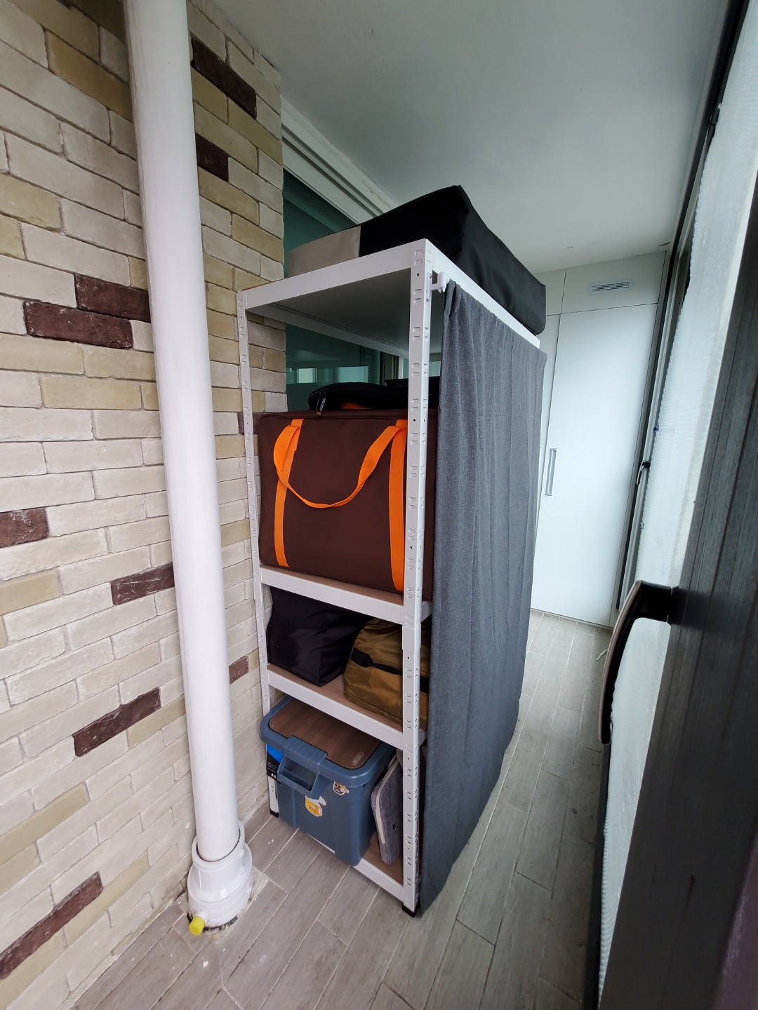 요렇게 커튼까지 치니까 훨씬 깔끔해 보이죠? 환기도 잘돼서 좋고 보관하기도 용이하고 눈에 보이니 찾기 쉬워서 설치하기를 정말 잘했다고 생각합니다. 집이 좀 더 크면 같은 사이즈로 하나 더 설치해 놓고 싶더라고요. 저희 부부 로망이 백패킹에 도전하는 거라서요. 백패킹 장비까지 보관하려면 더 큰집으로 이사 가야 할 텐데 말이에요. ㅎㅎ