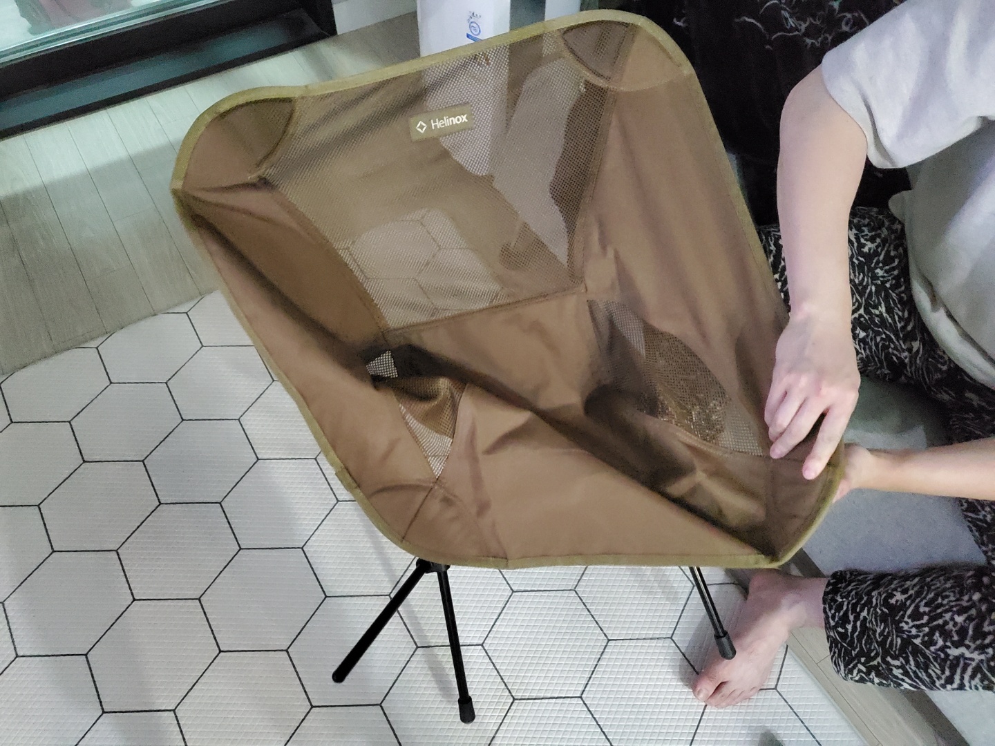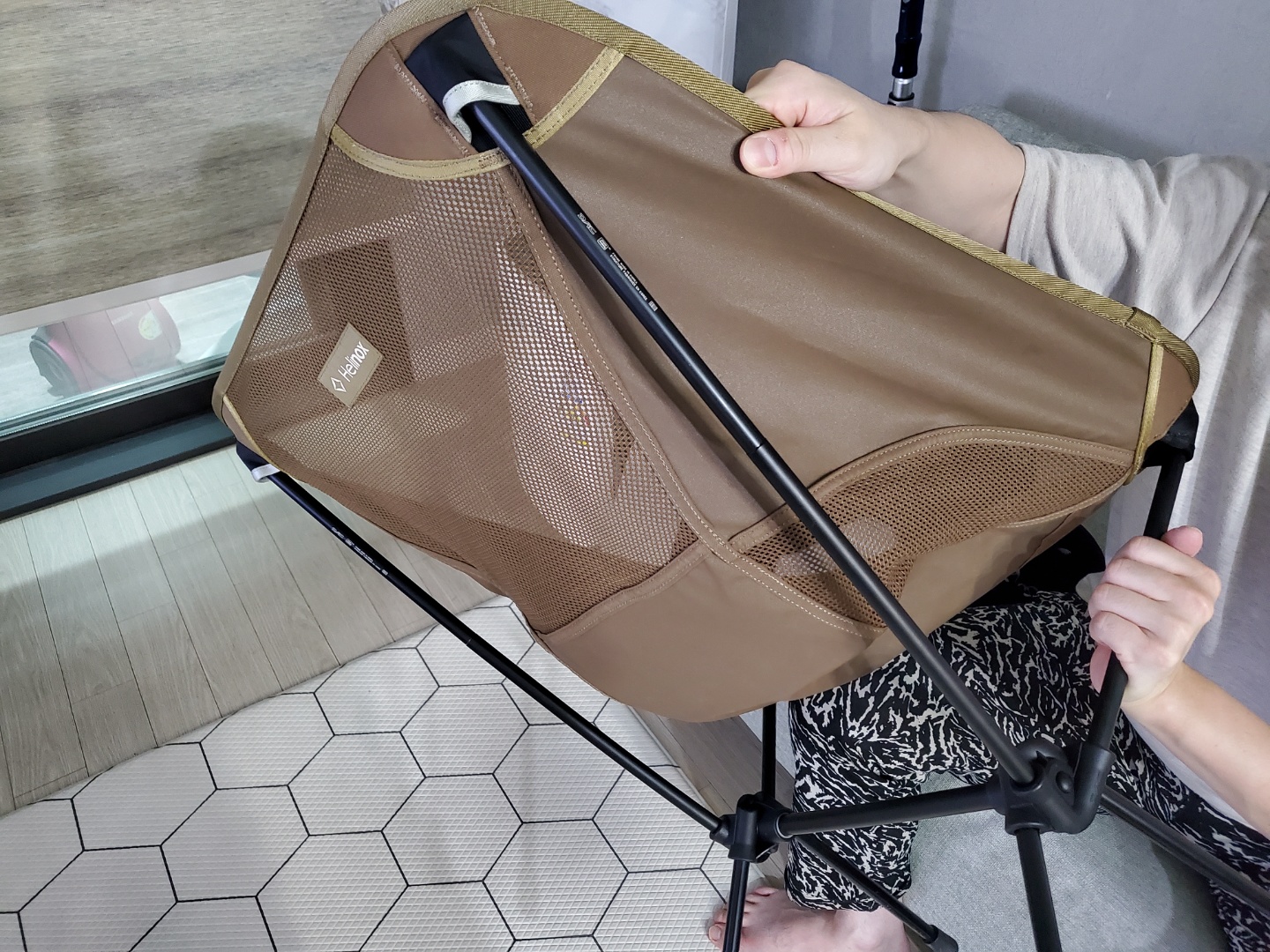 그리고 또 좋아하는 점이 헬리녹스 체어원 원단인데요. 진짜 원단 디자인과 선택은 정말 잘한 것 같아요. 다른 비슷한 원단과 비슷한 디잔인이 엄청 많이 나오는데요 촥 감싸 안기는 느낌이라던지 너무 거칠지 않은 원단이라던지 체중이 실리면 탄탄하게 잡아주는 부분이 정말 마음에 듭니다. 뻗뻗하지만은 않은 원단이에요. 만져보시면 알 거예요. 딱 보면 이거 물건이고 오래 쓰겠다 싶거든요.