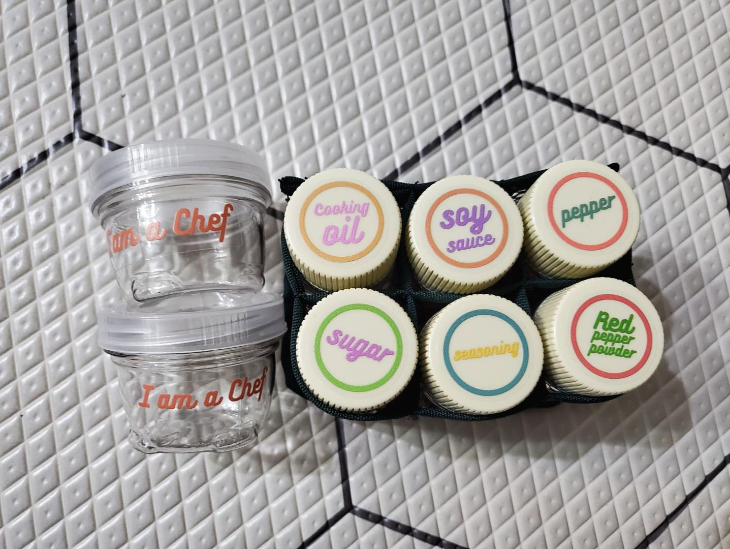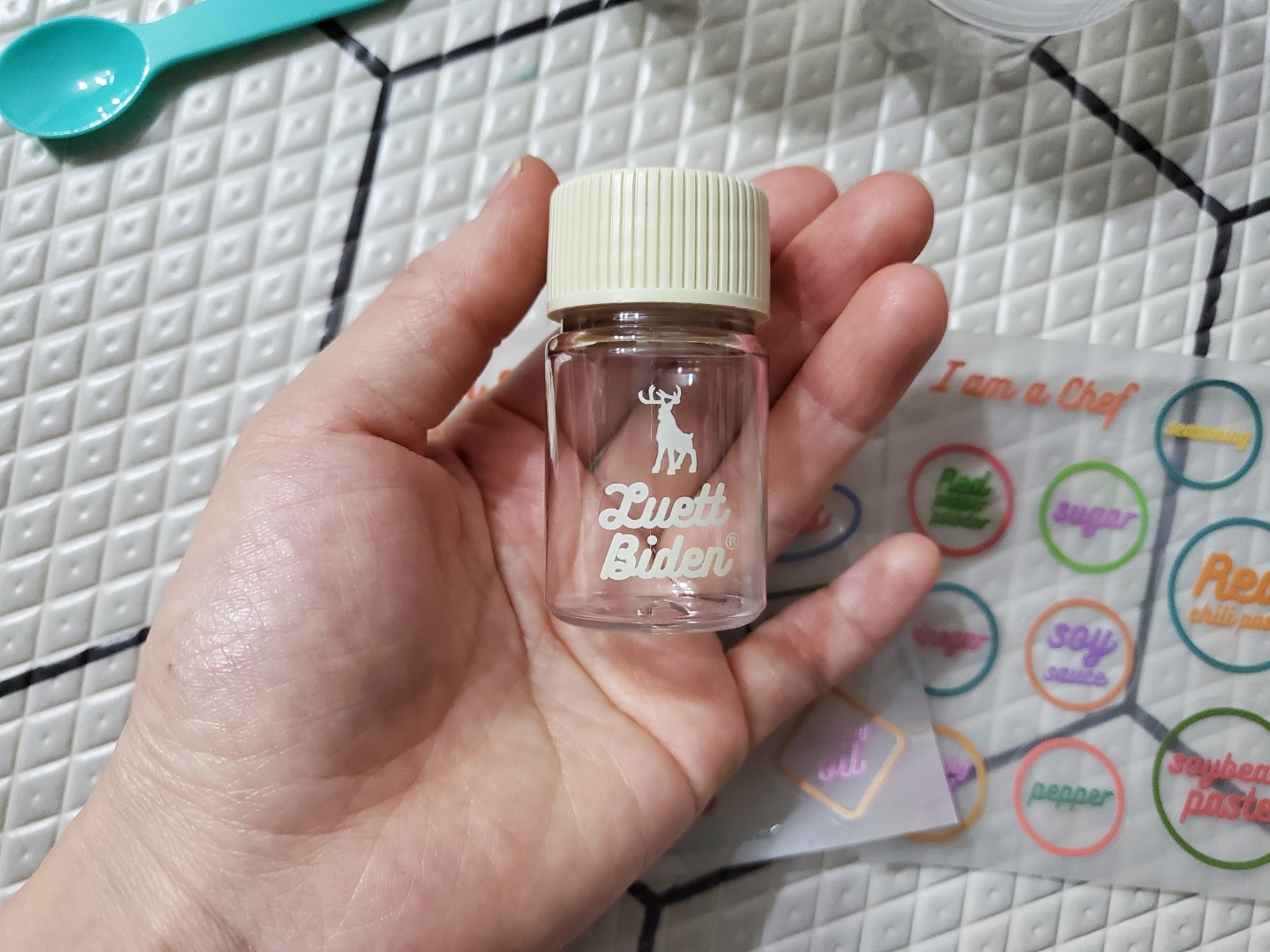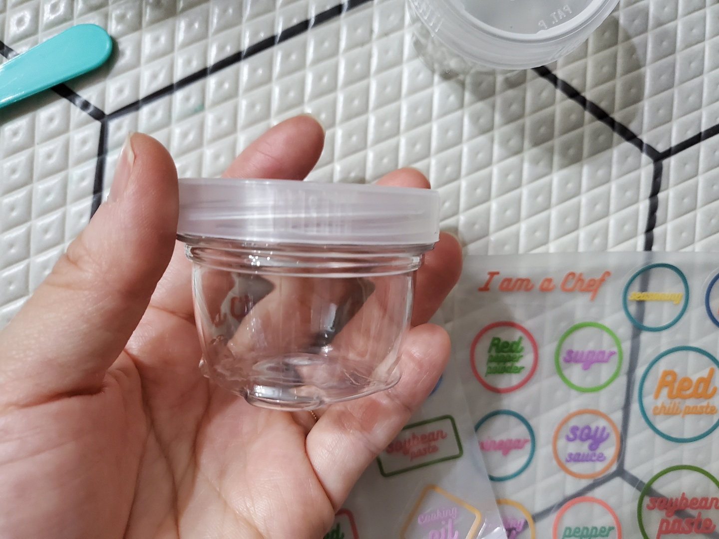 안에는 25ml의 양념통 6개와 40ml 용기 2개 그리고 작은 스푼 1개가 들어 있어요. 그리고 스티커는 덤입니다.