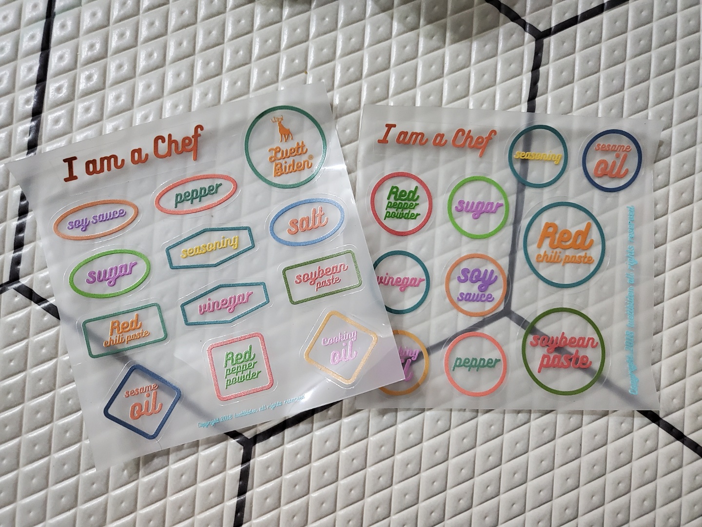 통에 알기 쉽게 표시하라고 해준 배려 같아요. 저는 설탕, 소금, 후추, 간장, 고춧가루, 후추 이렇게 6개 꼭 필요한 양념만 담으려고 스티커를 붙였어요. 의외로 스티커 하나하나 붙이는 재미가 있습니다. 다 붙이면 더 귀여워요. 아기자기한 거 좋아하는 여성분들한테 정말 취향 저격일 거예요.