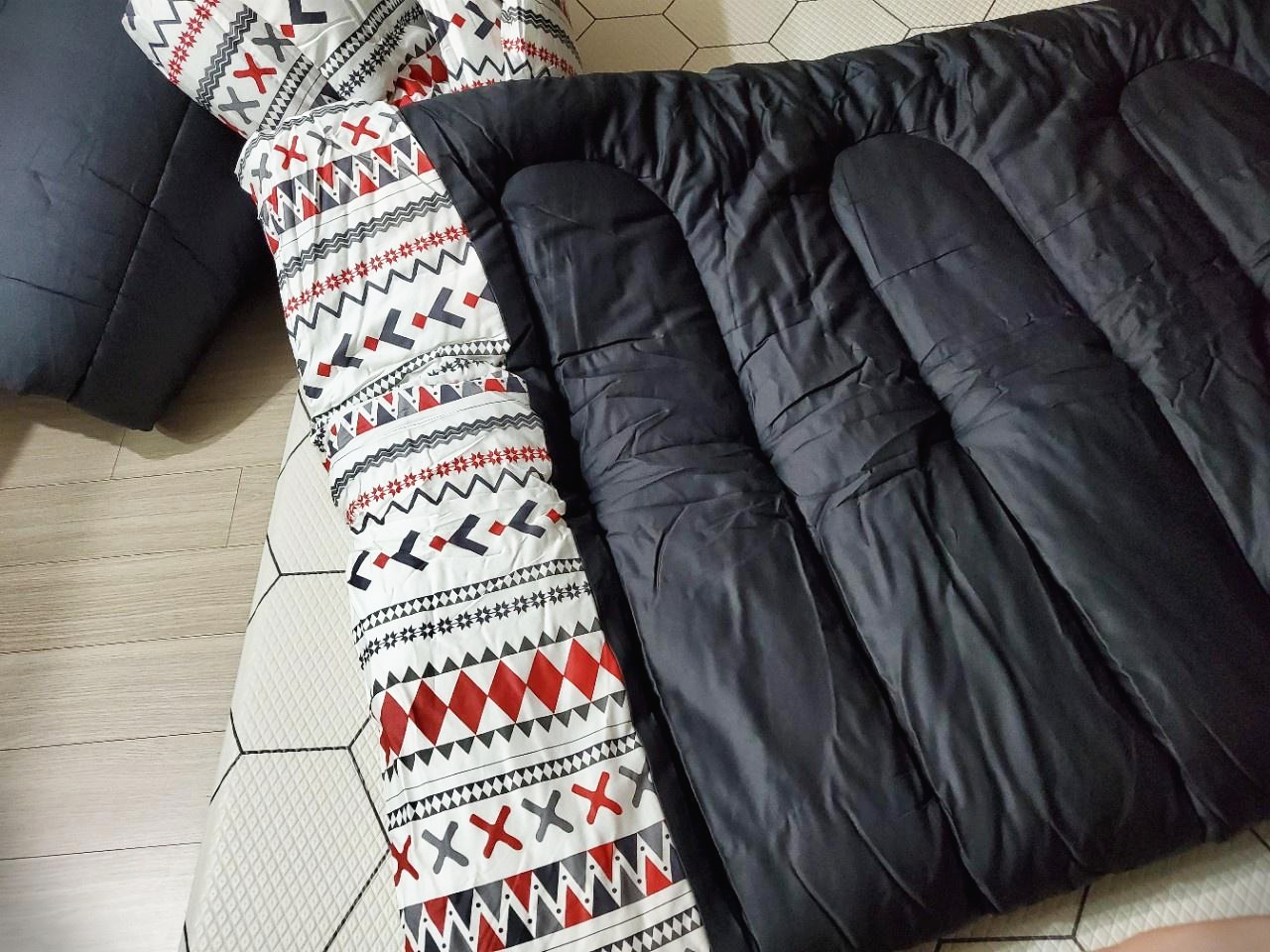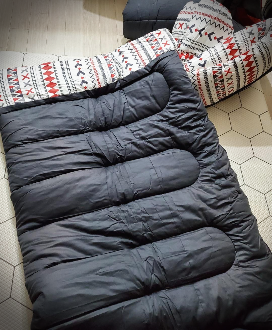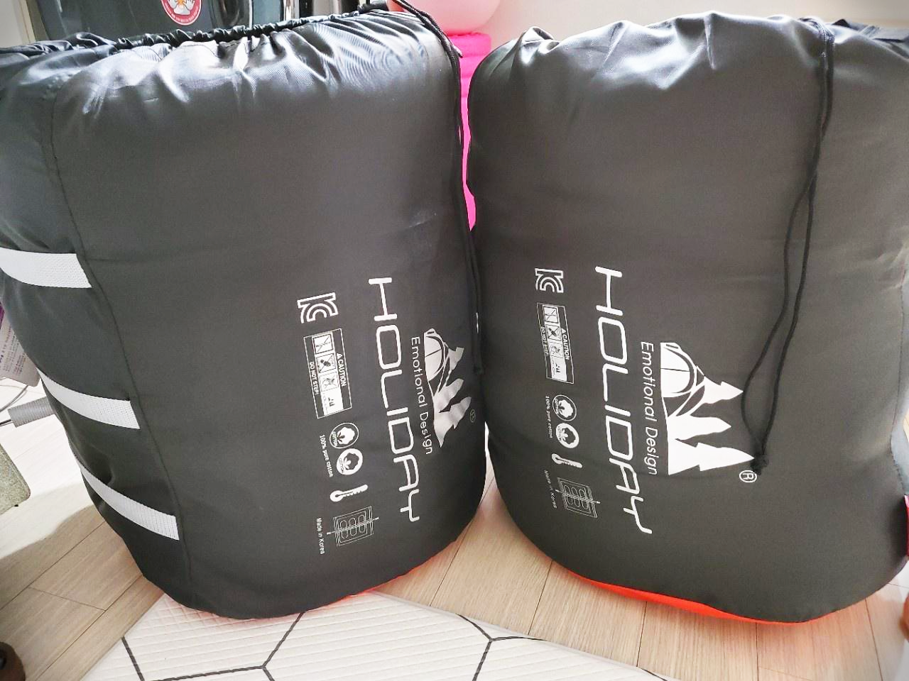 이 홀리데이 몬스터 침낭을 실제로 받아보고 놀랐던 점이 2가지가 있는데요. 첫째로 엄청 크고 무겁다 였어요. 생각보다 부피를 엄청 차지한다고 느껴져요. 무게도 무겁고요. 저 여자 한 손에 두 개는 못 들겠더라고요. 이게 최대 단점이라면 단점이에요. 그리고 두 번째로 놀란 점은 진짜 솜이 빵빵하다였어요. 첫 번째로 느꼈던 부분이 이 솜 때문이겠지만요, 충전재가 빵빵하고 무거워서 그만큼 매우 따뜻하고 만족스럽습니다. 지난가을 캠 때 정말 잘 사용했어요. 사용하시던 분들이 충전재가 좋아서 세탁을 해도 보풀도 잘 안 나고 숨도 잘 안 죽어서 바꾸고 싶은데 계속 사용하고 있다고 했거든요. 그런데 진짜 그렇더라고요. 세탁을 맡겼는데도 변형도 없고 솜도 그데로에요. 너무 만족스러워서 이번 겨울은 이불 대신 침낭을 집에서도 썼는데 굉장히 따뜻하더라고 좋더라고요.