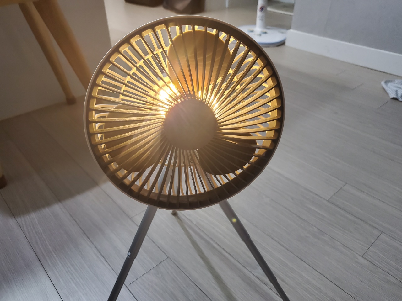 그리고 헤드 각도가 조절이 되는데요. 이건 어느 선풍기와 마찬가지로 수동으로 조작을 해줘야 합니다. 이 부분은 어디에나 있는 부분이니까 꼭 있어야 하는 부분이죠. 그리고 센스 있게 버튼을 누르면 선풍기 날개 뒤로 조명도 나옵니다. 캠 가서 저녁에 음식 할 때 밤에 불멍 할 때 옆에 두면 정말 편해요 조명이 따로 필요 없으니까요. 지나가다 치고 넘어 뜨릴일도 없고요.