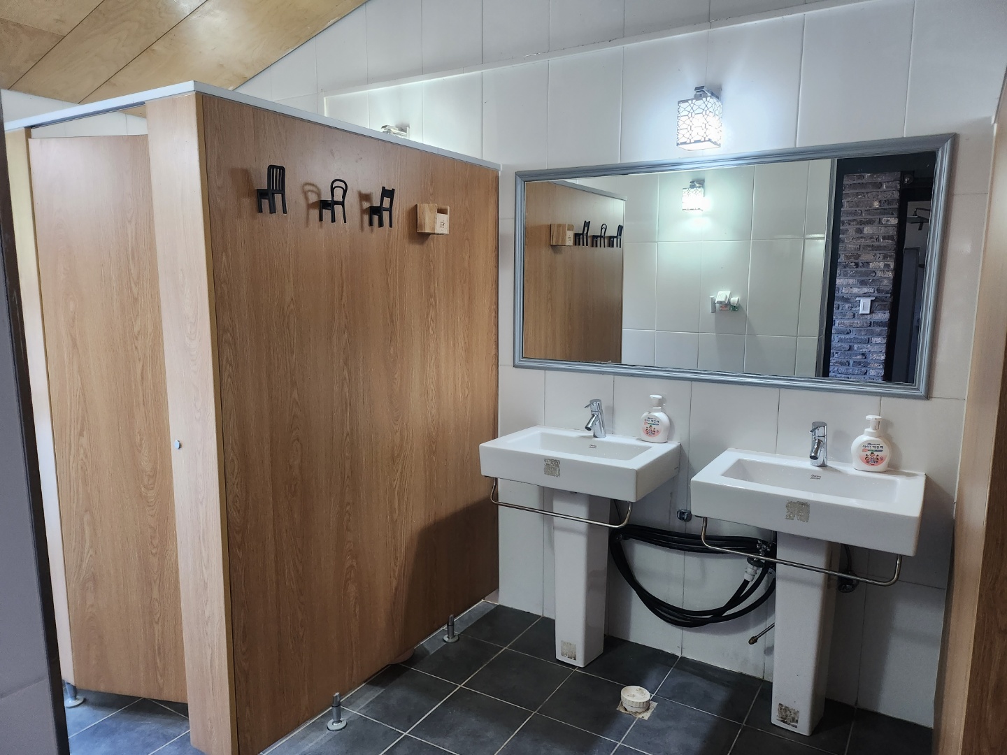 화장실은 깨끗하게 운영되고 있었습니다. 사진상 보이는 부분이 여자화장실과 샤워실인데요. 저희가 노 키즈에 화장실 깨끗한 곳을 주로 다니다 보니까 화장실에도 굉장히 예민한 편입니다. 샤워실이 생각보다 깨끗하고 관리가 잘되어있어서 놀랐어요. 샤워기 맞은편으로는 옷 보관하고 갈아입는 공간 그리고 드라이기까지 구비가 잘 돼있고 정리정돈이 잘 돼있어서 2박을 해도 불편하지 않겠구나라는 생각이 들었습니다.