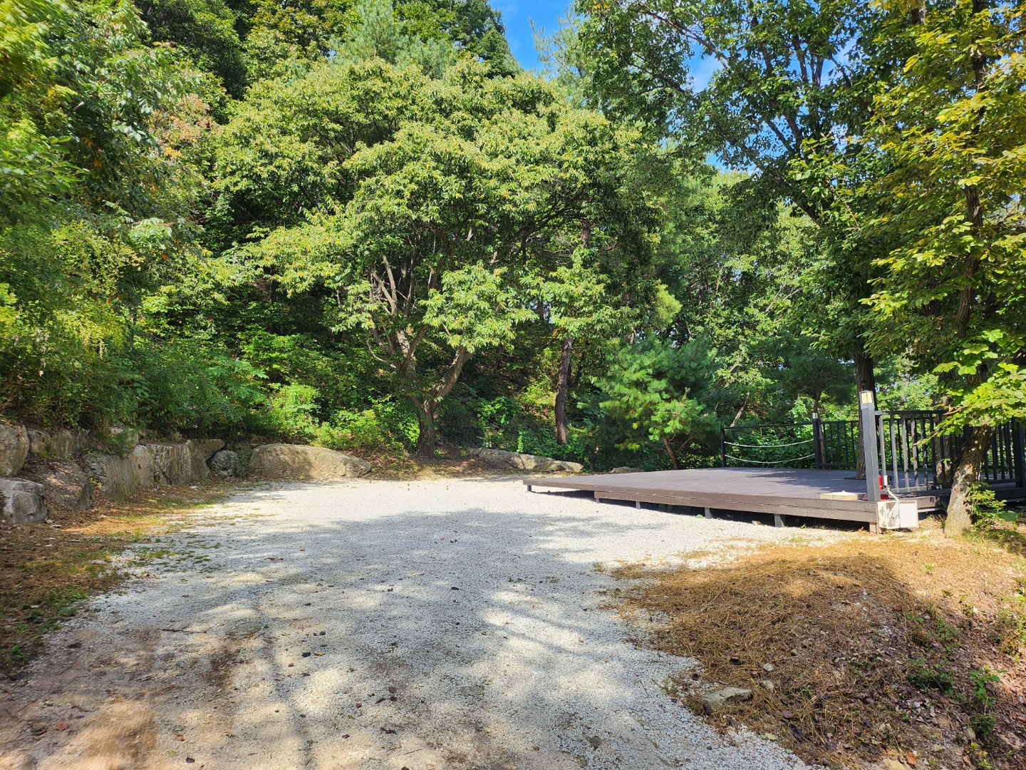 B사이트는 대체적으로 다 넓었어요.명당인 이유가 있더라고요. 사이트 활용하기가 참 좋아요. 데크에 올려도 되고 파쇄석에 피칭을 해도 되고 자유롭죠. 주차도 마음대로 가능하고요. 가족단위가 오면 참 좋겠더라고요. B3는 데크가 안쪽의 구석진 자리에 있고 파묻힌 느낌입니다.