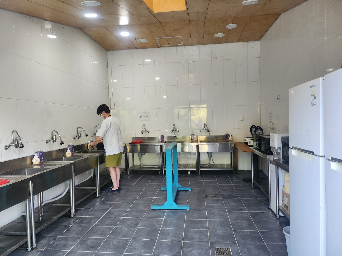 개수대도 너무 깨끗하고 관리가 잘 되어 있었어요. 냉장고가 2대나 있어서 꼭 보관해야 할 음식들은 이곳에 옮겨 놔도 좋을 것 같아요. 밥솥이랑 정수기, 전자레인지 정말 필요한 것들만 딱 구비되어있어요.