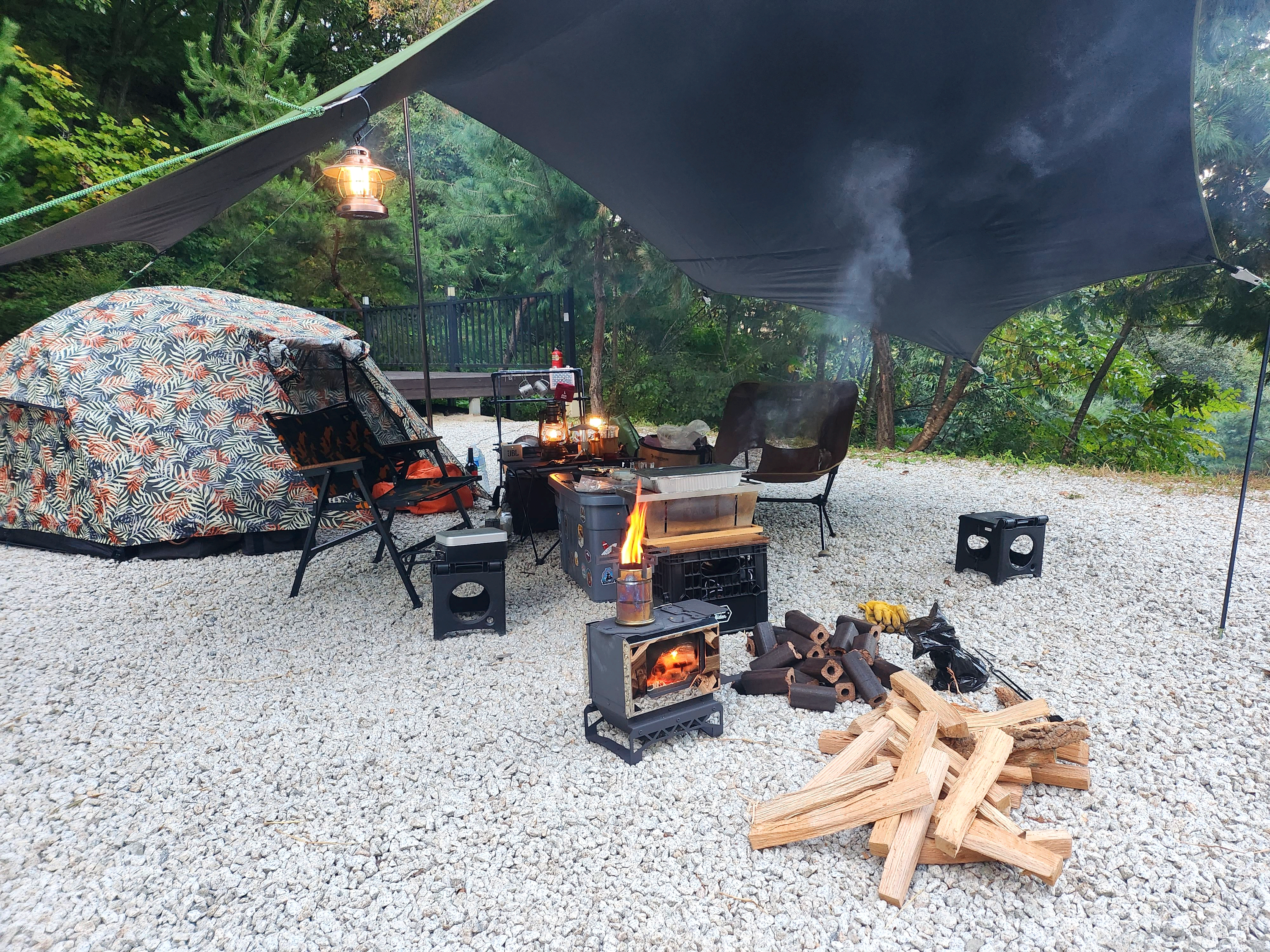 애매하면 더 챙겨가는 겁니다. 9월 마지막 주에 캠핑을 다녀왔는데요. 그때 마지막으로 미니멀 웍스 폼므와 옥타 타프를 챙겨갔습니다. 날씨가 좋다고 하기도 했고 마지막으로 장비 한번 더 써보고 쉘터를 사용해보고 싶었거든요. 쉘터를 써야 되는 시점은 무조건 난로와 함께 간다를 공식으로 생각하면 됩니다.