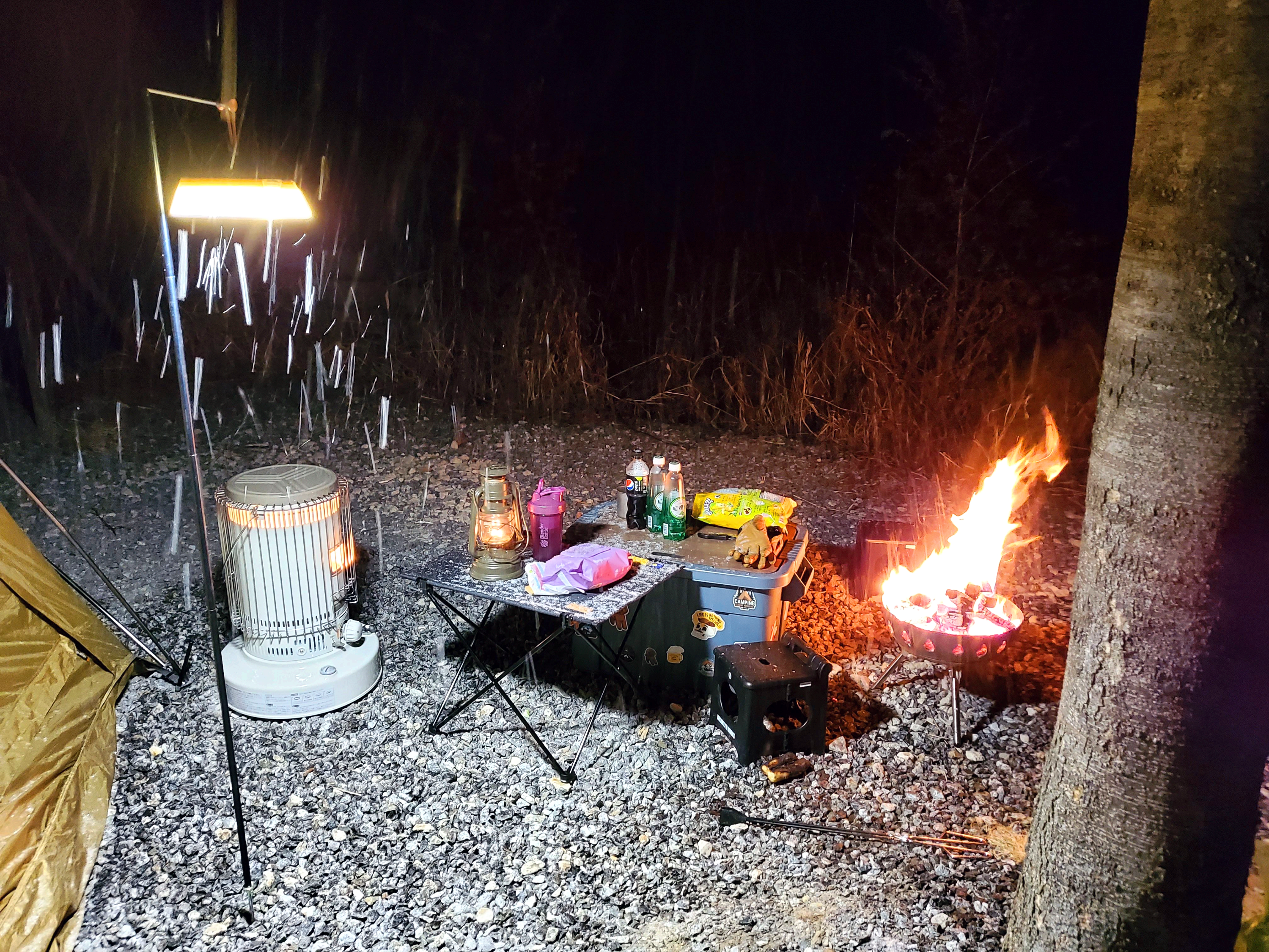 지난 동계 캠핑을 설중 캠핑을 했었는데 옴니 230을 왼쪽에 두고 오른쪽에는 화로대를 놓고 음식을 해 먹었는데 밖에 있을만하더라고요.
