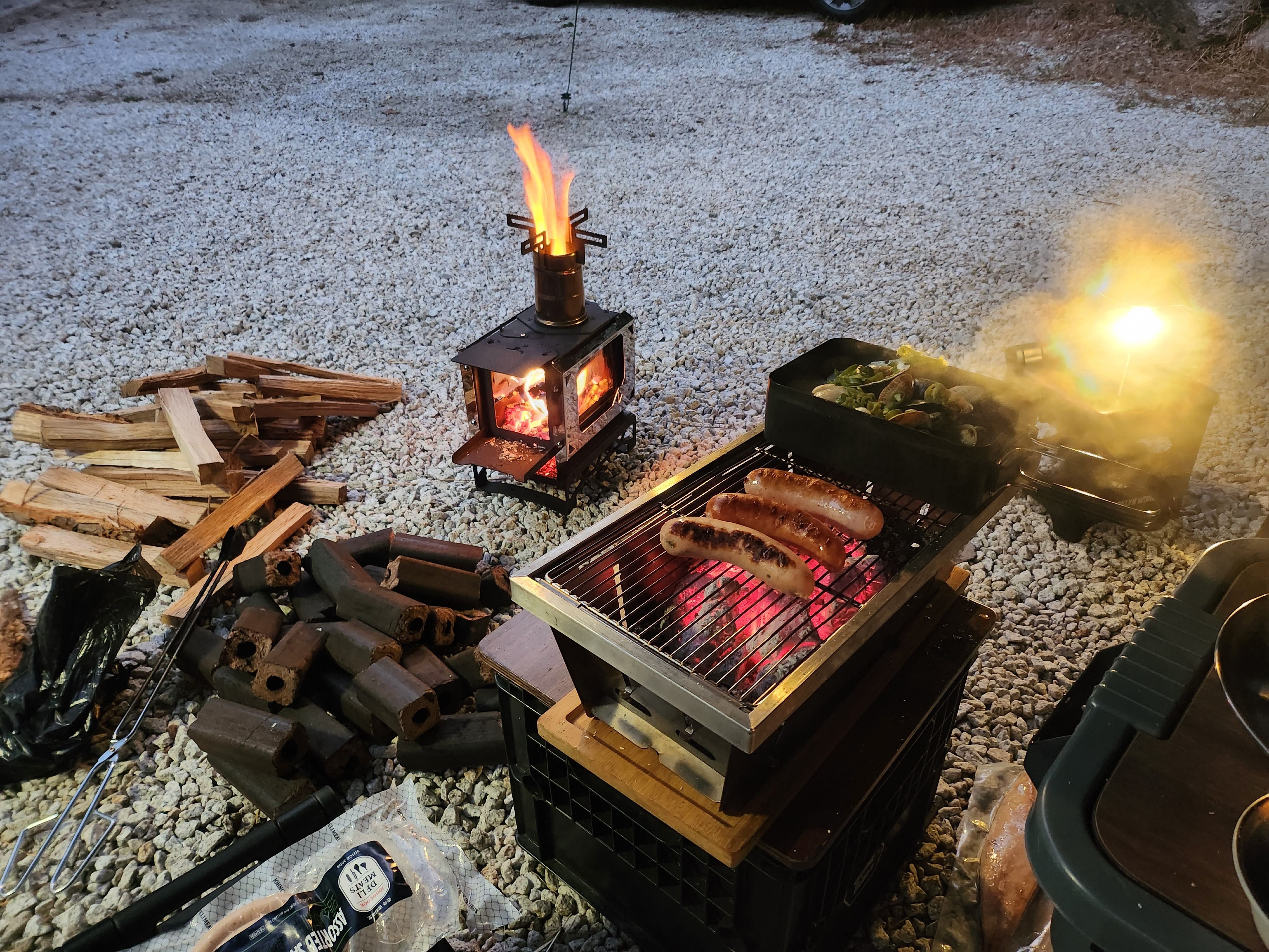 오후 4시가 되니 갑자기 기온이 쌀쌀해지기 시작했습니다. 이때부터 조금 걱정이 되기 시작하더라구요. 이날은 화로대도 안 가져가고 소형 난로를 가져갔거든요. 과연 버틸 수 있을까 하는 생각이 들더라고요. 다행히 속에 챙겨 입을 옷을 더 가져가서 껴입고 겉에는 플리스를 입고 제가 제일 사랑하는 아이템 발열조끼를 입었습니다. 그리고 음식하고 이리저리 움직이다 보니 그렇게 춥진 않더라고요.